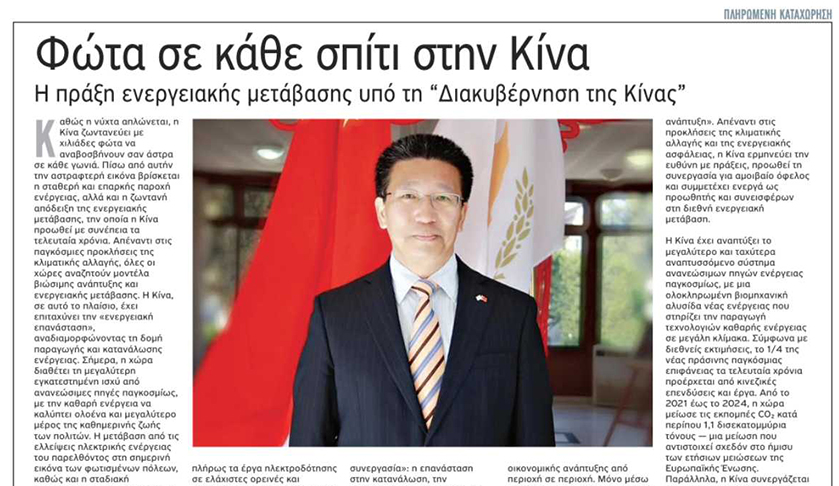驻塞浦路斯大使刘彦涛在塞《公民报》发表署名文章《灯火万家下的中国——“中国之治”的能源转型实践》