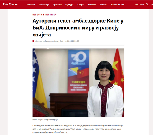 2025年10月2日,驻波黑大使李凡在《塞族之声》《解放报》《晚报》等波黑三大主流媒体发表署名文章《彰显大国担当,为世界和平发展注入正能量》,宣介中方提出的四大全球倡议,重点就联大第2758号决议的合法性、有效性、权威性阐明中方立场,受到波黑各界广泛关注和积极评价。全文如下: