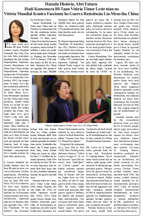 2025年8月8日,驻东帝汶大使王文丽在东帝汶主流媒体发表署名文章《铭记历史 开创未来——纪念中国人民抗日战争暨世界反法西斯战争胜利80周年》,全文如下: