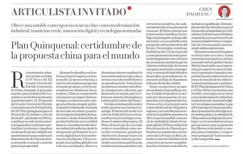 2025年11月7日,驻墨西哥大使陈道江在墨主流媒体《千年报》发表题为《“十五五”规划:为世界提供确定性的“中国方案”》的署名文章,从“以改革破局、以创新立势”“以绿色筑基、以科技架桥”“以开放领航、以互鉴共荣”三方面深入解读党的二十届四中全会精神及“十五五”规划的世界意义。文章强调,中国“十五五”规划与“墨西哥计划”在关键领域高度契合,必将为深化中墨全面战略合作伙伴关系开辟新的道路和前景。