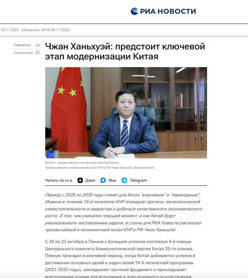 2025年11月5日,驻俄罗斯大使张汉晖在“今日俄罗斯”国际媒体集团发表署名文章《擘画发展新蓝图 谱写时代新华章》。全文如下: