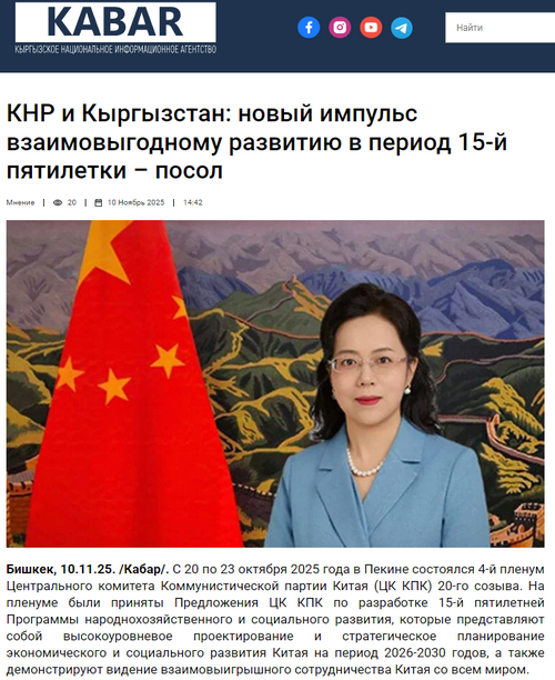2025年11月10日,驻吉尔吉斯斯坦大使刘江平在吉卡巴尔国家通讯社网站发表署名文章《“十五五规划”将为中吉互利合作注入强劲动能》。全文如下: