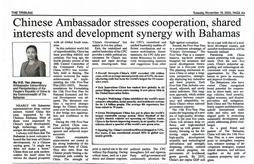 2025年11月18日,驻巴哈马大使严家蓉在巴第一大纸媒《论坛报》发表署名文章《中巴深化互利合作、深化共同利益、促进协同发展》。全文如下: