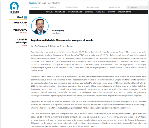 2025年11月27日,驻厄瓜多尔大使孙向阳在厄主流媒体《电讯报》、新媒体“证实网”等发表署名文章《中国之治,世界之幸》,宣介中国治理成就及其带来的世界机遇。全文如下: