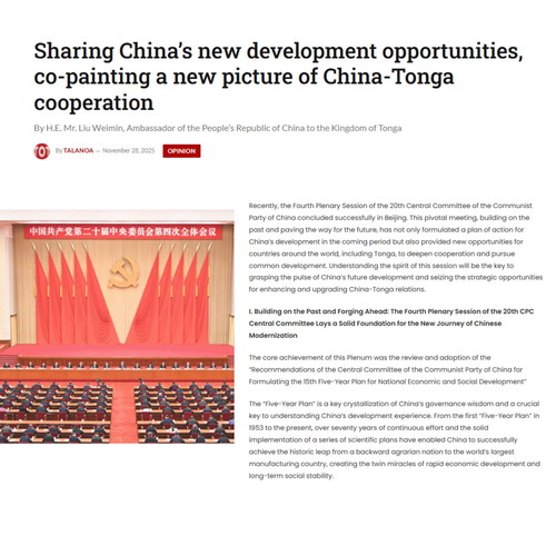 2025年11月28日,驻汤加大使刘为民在汤加主流媒体“TOT新闻网”发表署名文章《共享中国发展新机遇 共绘中汤合作新画卷》,介绍中国共产党第二十届中央委员会第四次全体会议精神,宣介中国“十五五”规划建议所勾勒的中国式现代化新图景,强调中国新征程将为汤加等太平洋岛国带来实实在在的发展机遇,中国愿与汤加进一步加强战略对接,深化领域合作,共绘中汤关系更加绚丽多彩的新画卷,为构建人类命运共同体作出积极贡献。全文如下: