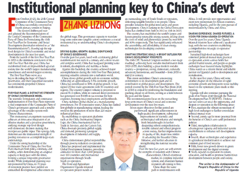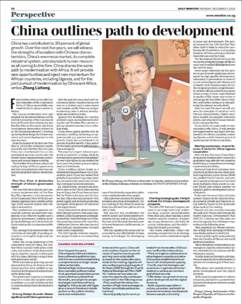 2025年12月1日,驻乌干达大使张利忠在乌第一、第二大报纸发表题为《中国发展的制度密码》署名文章,宣介党的二十届四中全会精神,解读“十五五”规划建议,展望中乌合作。全文如下: