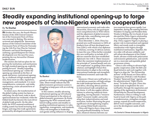 2025年12月1日至3日,驻尼日利亚大使于敦海在《先锋报》《太阳报》《论坛报》《市民报》《黎明报》《新闻社》《环球每日新闻》《新闻锚点》等尼主流媒体发表题为《稳步扩大制度型开放,开创中尼合作共赢新局面》的署名文章。全文如下: