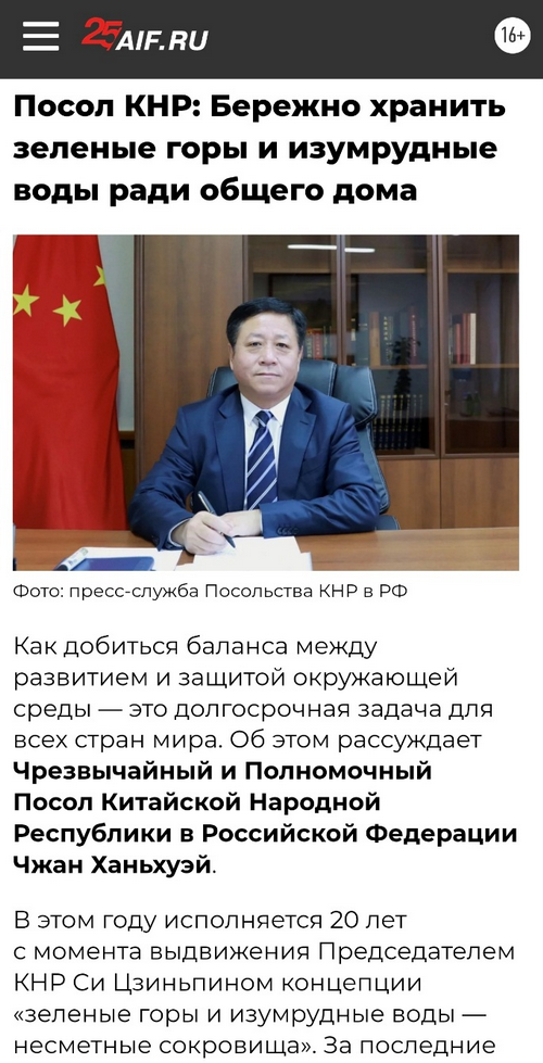 2025年12月3日,驻俄罗斯大使张汉晖在《论据与事实报》发表署名文章《守护绿水青山 共建美丽家园》。全文如下: