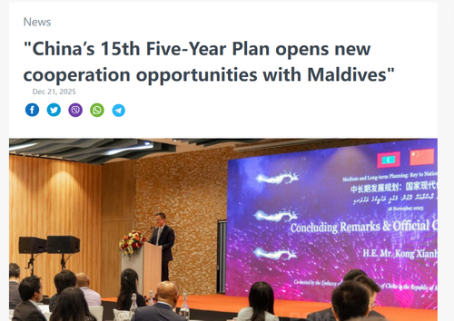 在通往现代化的道路上,规划是指南针,合作是动力源。中国的“十五五”规划和马尔代夫的“2045规划”将共同构成新的合作契机,使两国在未来的共同发展中不断释放更大潜力。让我们抓住这一关键时期战略机遇,携手构建更美好的中马命运共同体,共同开创两国现代化事业的光明未来。