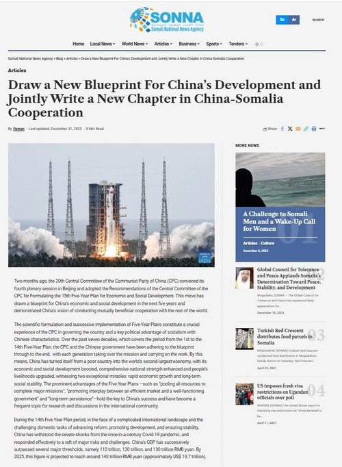 2025年12月31日,驻索马里大使王昱在索马里国家通讯社发表署名文章《绘就中国发展新蓝图 共谱中索合作新篇章》。全文如下: