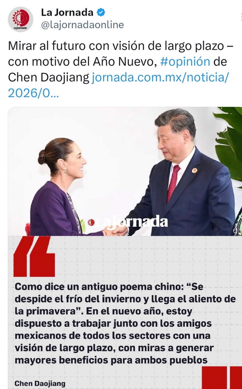 2026年1月2日,驻墨西哥大使陈道江在墨主流媒体《每日报》头版发表题为《目光长远向前看——写在新年之际》的署名文章。文章强调,中国始终以长远眼光和务实行动,将自身发展置于人类共同发展的宏阔图景之中。中国以五年规划为引领、以互利共赢为导向、以共建命运共同体为目标,着眼自身发展、推进中墨友好、引领中拉共济。合作共赢是符合中墨双方根本利益的唯一正确选择。两国的政治家们和有识之士,要以5年、10年、甚至50年为维度来看待和规划两国关系,为子孙后代的长远利益负责。
