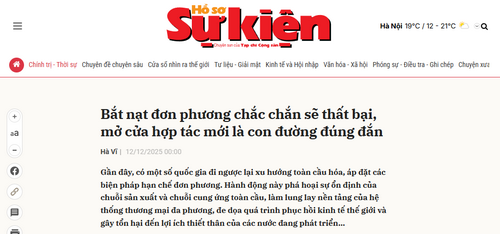 2025年12月12日,驻越南大使何炜在越主流媒体《共产主义杂志》发表署名文章《单边霸凌注定失败,开放合作方为正道》,全文如下: