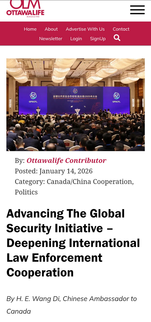 2026年1月14日, 驻加拿大大使王镝在加媒体《渥太华生活》杂志发表署名文章《践行全球安全倡议 深化国际执法合作》。全文如下: