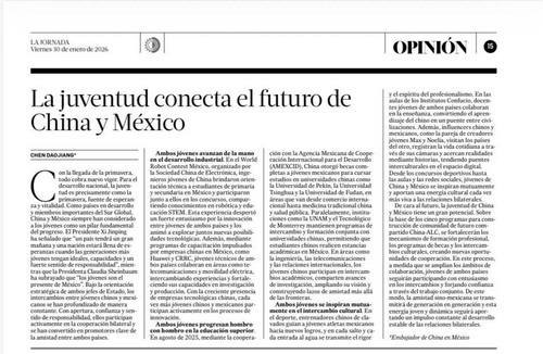 2026年1月30日,驻墨西哥大使陈道江在墨主流媒体《每日报》发表题为《青春之桥连接中墨未来》的署名文章。文章强调,中国和墨西哥同为发展中国家和全球南方重要力量,始终将青年视为国家发展的生力军。中墨青年在世界机器人大赛、在墨中企培训项目中携手创新,在两国一流学府共享工程技术、中医等领域研究成果,在跳水赛场、孔院、网络平台上互动交流,成为中墨关系的重要参与者和推动者。在中拉命运共同体建设“五大工程”的持续推进下,中墨青年将为两国友好注入持久而鲜活的青春力量。