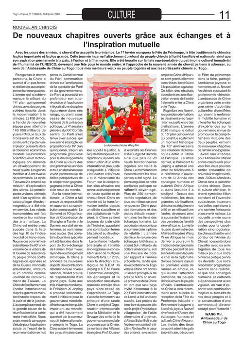 2026年2月10日,驻多哥大使王敏在多最大官方媒体《多哥新闻报》发表题为《欢乐祥和迎新年,交流互鉴谱新篇》署名文章。全文如下: