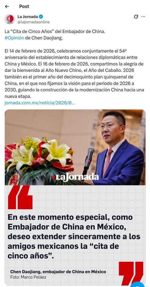 2026年2月14日,我们共同庆祝中墨建交54周年。2026年2月16日,我们一起分享迎接中国新年—马年新春的幸福快乐。2026年,也是中国“十五五”规划的第一年,我们锚定落实2026年至2030年的五年愿景,引领中国式现代化建设迈入崭新阶段。在这个特殊的时点,作为中国驻墨西哥大使,我要向墨西哥朋友们真诚地发出“五年之约”。