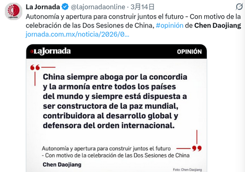 2026年3月14日,驻墨西哥大使陈道江在墨主流媒体《每日报》发表题为《开放自主,共创未来》的署名文章,从APEC中国年、中拉关系、人类命运共同体等方面宣介中国两会精神。文章强调,拉美国家走什么道路要由拉美人民自己选择,与谁交朋友要由拉美国家自己决定。中方相信,墨西哥作为拉美地区大国,将坚持独立自主、反对外来干涉的正义立场,为推动中拉合作发挥更重要作用。中方期待同墨方一道,坚持在开放发展中分享机遇、实现共赢,为中拉命运共同体建设带来新的机遇,也为世界合作增添更多稳定与动力。