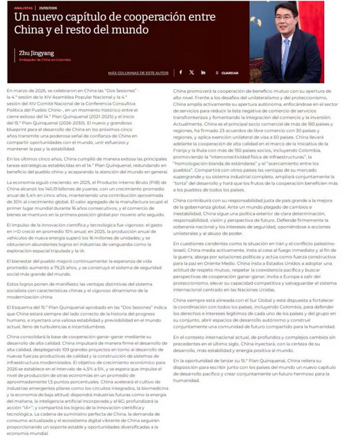 2026年3月25日,驻哥伦比亚大使朱京阳在哥《共和国报》发表署名文章《书写中国与世界互利共赢的新篇章》,系统深入宣介2026年全国两会精神,解读中国“十五五”规划为世界带来的机遇与确定性,展望全球南方共谋发展振兴、共创美好未来光明前景。中文全文如下: