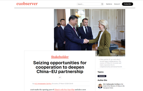 2026年3月27日,驻欧盟使团团长蔡润大使在欧洲主流媒体欧盟观察网发表题为《把握中欧合作机遇 深化双方伙伴关系》的署名文章。全文如下: