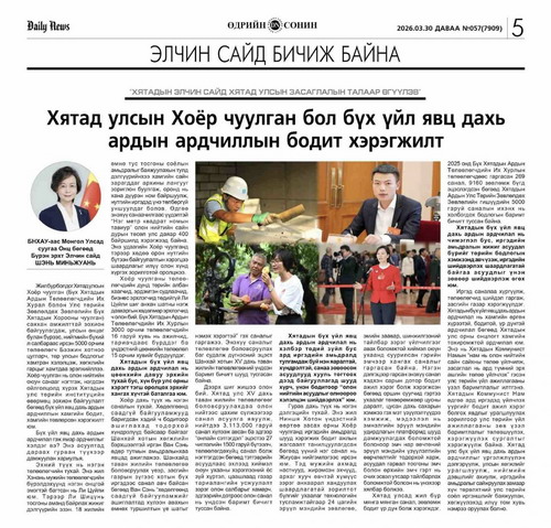 2026年3月30日,驻蒙古大使沈敏娟在蒙古《日报》“中国大使谈中国之治”专栏以及蒙古主流媒体蒙古新闻网发表署名文章《中国两会是全过程人民民主的生动实践》。全文如下: