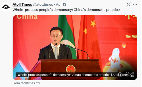 2026年4月13日,驻马尔代夫大使孔宪华在《环礁时报》等当地主流媒体发表题为《全过程人民民主——中国的民主实践》的署名文章,全文如下: