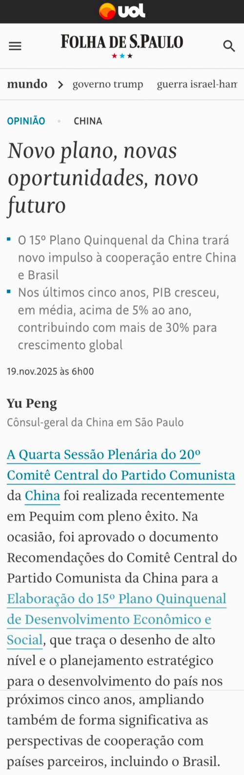 2025年11月19日,驻圣保罗总领事余鹏在巴西主流媒体《圣保罗页报》发表署名文章《新蓝图 新机遇 新未来》,宣介党的二十届四中全会精神和“十五五”规划建议。全文如下:
