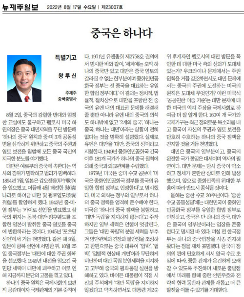 2022年8月17日,驻济州总领事王鲁新在《新济州日报》发表署名文章《世界上只有一个中国》,介绍台湾问题历史经纬,强调世界上只有一个中国,台湾是中国领土不可分割的一部分,中华人民共和国政府是代表全中国的唯一合法政府,一个中国原则是国际社会的普遍共识和国际关系基本准则,中国实现国家完全统一是大势所趋,也是历史必然。今年是中韩建交30周年,期待韩方继续坚定站在正义一边,本着两国建交初心,共同推动中韩睦邻友好和战略合作伙伴关系在新的起点上面向未来,取得新的更大发展。主要内容如下: