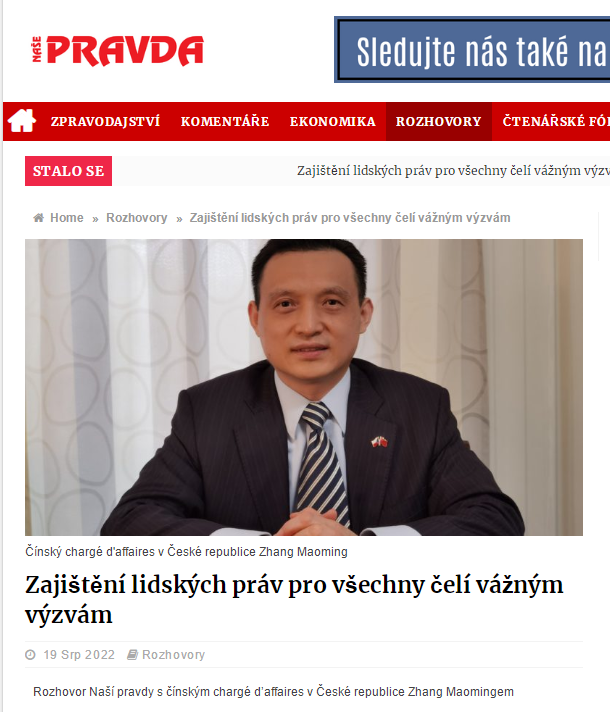 2022年8月19日,捷克媒体《我们的真相》刊发对驻捷克使馆临时代办张茂明书面采访。张茂明临时代办在采访中宣介习近平总书记在有关省部级主要领导干部专题研讨班上的重要讲话精神,阐明中方关于当前台海局势等严正立场,介绍我国经济发展、疫情防控等情况。采访全文如下:
