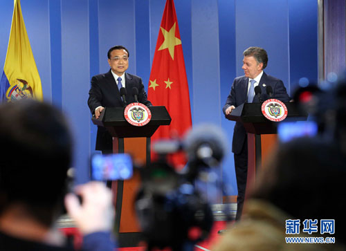 当地时间5月21日下午,国务院总理李克强在波哥大同哥伦比亚总统桑托斯举行会谈后共同会见记者。