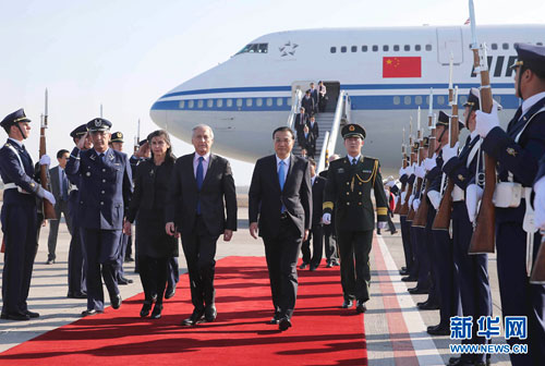 智利外交部长穆尼奥斯等政府高级官员前往迎接。礼兵列队向李克强夫妇致意。中国驻智利大使李宝荣也到机场迎接。