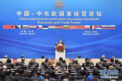 2015年11月24日下午,国务院总理李克强在苏州太湖国际会议中心与中东欧16国领导人共同出席中国-中东欧国家第五届经贸论坛开幕式并致辞。