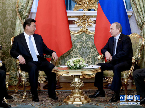 当地时间5月8日,国家主席习近平在莫斯科克里姆林宫同俄罗斯总统普京举行会谈。普京热烈欢迎习近平应邀前来出席纪念卫国战争胜利70周年庆典并访问俄罗斯。习近平感谢普京的盛情邀请。两国元首在亲切友好的气氛中,就中俄关系和彼此关心的重大国际和地区问题充分交换意见,一致同意中俄要共同维护第二次世界大战胜利成果和国际公平正义,推进丝绸之路经济带建设同欧亚经济联盟建设对接。