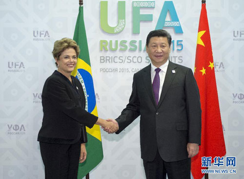 当地时间7月9日,国家主席习近平在俄罗斯乌法会见巴西总统罗塞芙。