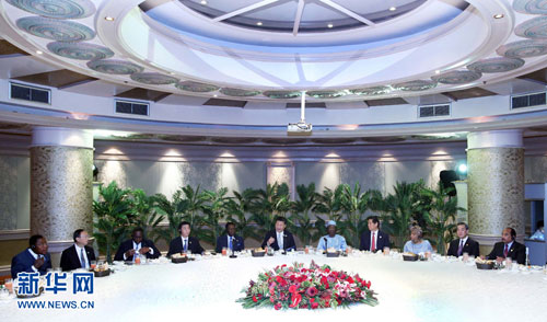 赤道几内亚总统奥比昂、乍得总统代比、塞内加尔总统萨勒、利比里亚总统瑟利夫、贝宁总统亚伊、毛里塔尼亚总统阿齐兹、科特迪瓦总统瓦塔拉、尼日尔总统优素福、佛得角总统丰塞卡、马拉维总统穆塔里卡、几内亚比绍总统瓦斯、赞比亚总统伦古、阿尔及利亚总理塞拉勒、中非共和国总理卡蒙、苏丹第一副总统巴克里、塞拉利昂副总统福、布隆迪第二副总统布托雷出席会见。