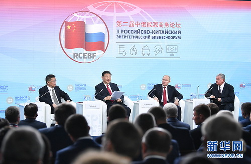 当地时间2019年6月7日,国家主席习近平在圣彼得堡同俄罗斯总统普京一道出席中俄能源商务论坛。
