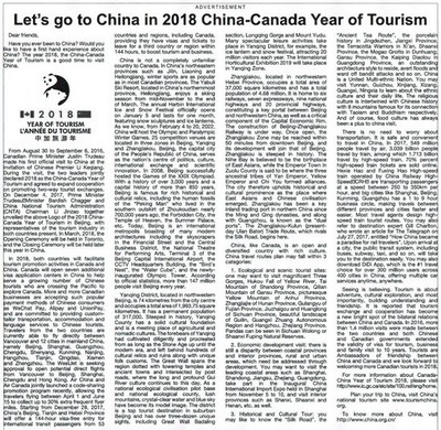 2018年1月10日,驻温哥华总领事佟晓玲在“温哥华太阳报”(Vancouver Sun)和“省报”(The Province)发表题为《2018“中加旅游年”,中国欢迎你》的文章指出,人文交流是中加关系和中国与不列颠哥伦比亚省关系的重要组成部分。欢迎加拿大朋友积极参与2018“中加旅游年”和2022年北京冬奥会等有关活动,增进两国人民了解与友谊。
