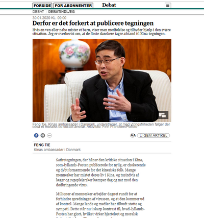 2020年1月30日,驻丹麦大使冯铁在丹麦《日德兰邮报》发表署名文章,抨击该报刊载辱华漫画。主要内容如下: