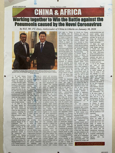 2020年2月4日,驻利比里亚大使付吉军在利《每日观察家报》、《新闻报》、利新社等主流和社交媒体发表题为《同舟共济,努力战胜新型冠状病毒感染肺炎疫情》的署名文章。