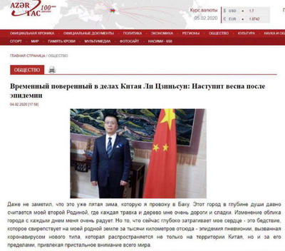 2020年2月4日,阿塞拜疆国家通讯社(АЗЕРТАДЖ)以中文、俄文、阿塞拜疆文3种文字全文刊登了驻阿塞拜疆使馆临时代办李劲松的署名文章《疫情过后是春天》,“趋势”通讯社等多家主流媒体转载。文章全文如下: