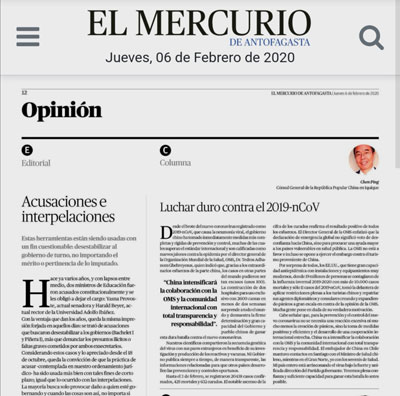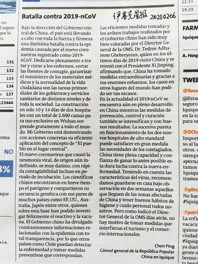 2020年2月6日,驻伊基克总领事陈平在《伊基克星报》和《安托法加斯塔信使报》上分别发表题为《打赢防控新冠疫情阻击战》和《打一场防控病毒的硬仗》的署名文章。