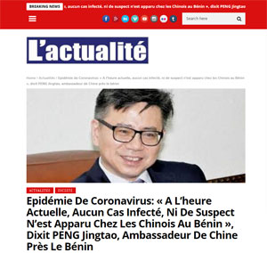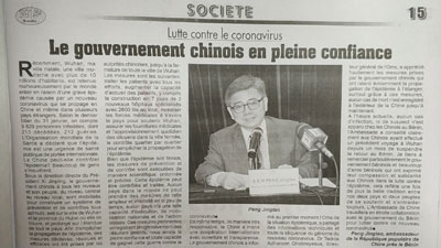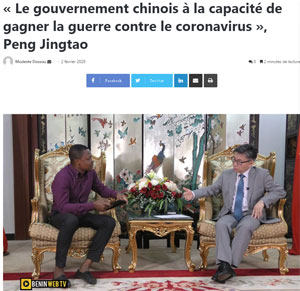 近日,贝宁官方媒体《民族报》及《别样观点》报、《时事》报、《经济学家》报、《我们的时代》报、贝宁网络电视等多家媒体登载驻贝宁大使彭惊涛署名文章,介绍中国疫情情况及政府采取的各项防控措施,表示中国政府有信心、有能力、有把握战胜疫情。