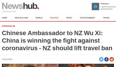 2020年2月12日,驻新西兰大使吴玺在知名新闻网站发表题为《携手努力,共同抗击疫情》的署名文章,介绍中国政府防控新型冠状病毒肺炎疫情举措及取得的成效,同时呼吁新方尽早取消旅行限制,同中方携手抗击疫情。