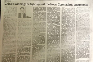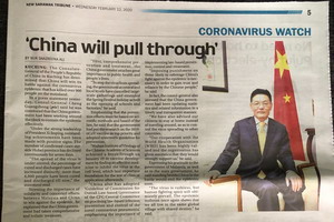 2020年2月12日,驻古晋总领事程广中在《婆罗洲邮报》(Borneo Post)、《沙捞越新论坛先驱报》(New Sarawak Tribune)等马来西亚英文主流媒体发表署名文章《中国抗击新冠肺炎正在取得积极成效》,介绍了中国防控新冠肺炎疫情的有力举措和最新进展,回顾了20世纪初马来西亚华人伍连德医生帮助中国防控东北鼠疫和霍乱疫情的动人故事,感谢马来西亚(沙捞越)各界为中国抗击新冠肺炎提供的积极协助,呼吁国际社会与中国一道携手应对疫情、共克时艰。