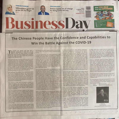 2020年2月14日,南非约翰内斯堡主流媒体《商业日报》刊登驻约翰内斯堡总领事唐中东署名文章《中国人民有信心、有能力打赢新冠肺炎疫情防控战》。
