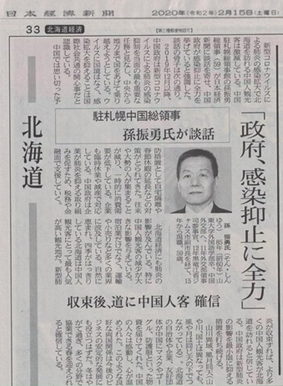 2020年2月15日,驻札幌总领事孙振勇在《日本经济新闻》发表题为《中国政府全力防控疫情》的署名文章。