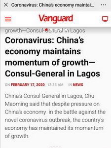 2020年2月16日至17日,尼日利亚英文媒体《拉各斯城市记者》、《太阳报》、《先锋报》分别发表驻拉各斯总领事储茂明的署名文章《中国经济保持增长势头》,主要内容如下: