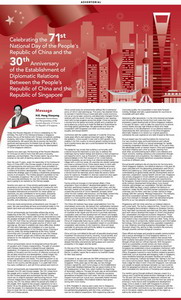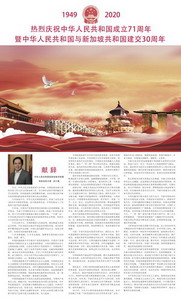 2020年10月1日,驻新加坡大使洪小勇在新加坡《联合早报》、《海峡时报》分别刊发中英文国庆献辞,介绍新中国成立71年来所取得的伟大成就。献辞中文如下: