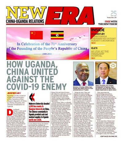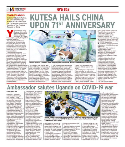 2020年10月1日,驻乌干达使馆在乌第一大报《新愿景报》上发表专刊,热烈庆祝中华人民共和国成立71周年。驻乌干达大使郑竹强和乌外长库泰萨分别在专刊上发表致辞。