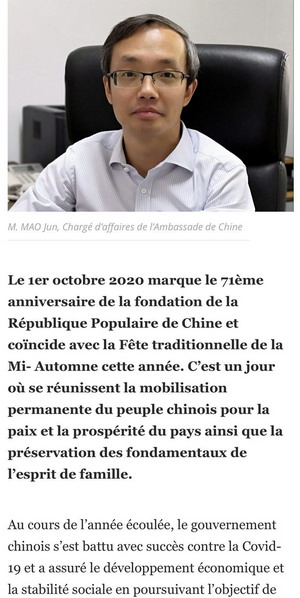 值此国庆71周年之际,驻摩洛哥使馆临时代办茅俊在当地主流媒体《挑战者周刊》发表题为《携手共进,谱写中摩战略伙伴关系新篇章》的署名文章,回顾过去一年我国统筹经济社会发展、抗击新冠肺炎疫情、开展抗疫国际合作的伟大成就,全面梳理中摩各领域友好交流合作成果,并展望两国战略伙伴关系发展美好未来。
