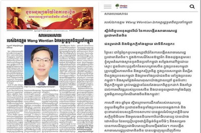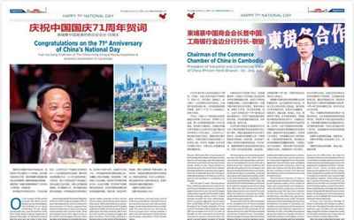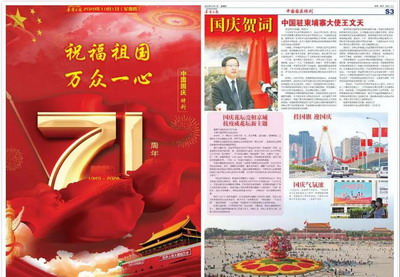 为隆重庆祝中华人民共和国成立71周年,驻柬埔寨使馆精心筹备发行庆祝国庆71周年媒体特刊,同期在当地《高棉时报》(英文)、《金边邮报》(英文、柬文)和《柬中时报》(中文、柬文)等主流媒体发行,刊登驻柬埔寨大使王文天国庆贺词并以系列图文全方位宣介中国发展和中柬务实合作;柬社会各界高度关注,主流媒体纷纷刊载王大使贺词并通过其官网、脸书、微信公众号等社交媒体扩大报道。